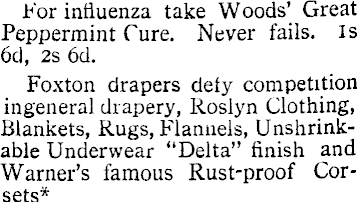 For influenza take Woods’ Great Peppermint Cure. Never fails, is 6cl, 2s 6d. Foxton drapers dety competition ingeneral drapery, Roslyn Clothing, Blankets, Rugs, Flannels, Unshrinkable Underwear “Delta” finish and Warner’s famous Rust-proof Corsets*