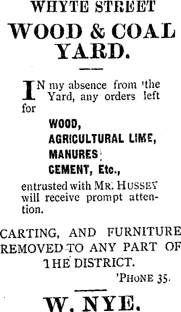 WHYTE STREET WOOD & COAL YARD. IN my absence from 'the Yard, any orders left for WOOD, AGRICULTURAL LIME, MANURES' CEMENT, Etc., entrusted with Mr. HusseV will receive prompt attention. CARTING. AND FURNITURE REMOVED TO ANY PART OF 1 HE DISTRICT. ’Phone 35. W. NYB.