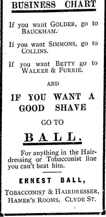 BUSINESS CHART If you want Colder, go to Bauckham.If you want Simmons, go to Collins. If you want Betty go to Walker & Furrie. and IF YOU WANT A GOOD SHAYE GOTO BALL. For anything in the Hairdressing or Tobacconist line you can't beat him. ERNEST BALL, Tobacconist & Hairdresser, Hamer’s Rooms, Clyde St.