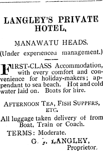 LANGLEY'S PRIYATB HOTEL, MANAWATU HEADS. (Under experienced management.) I7URST-CLASS Accommodation, ; with every comfort and convenience for holiday-makers; appendant to sea beach. Hot and cold water laid on. Boats for hire. Afternoon Tea, Fish Suppers, etc. All luggage taken delivery of from Boat, Train or Coach. TERMS: Moderate. O, >. BANGLEY, Proprietor-