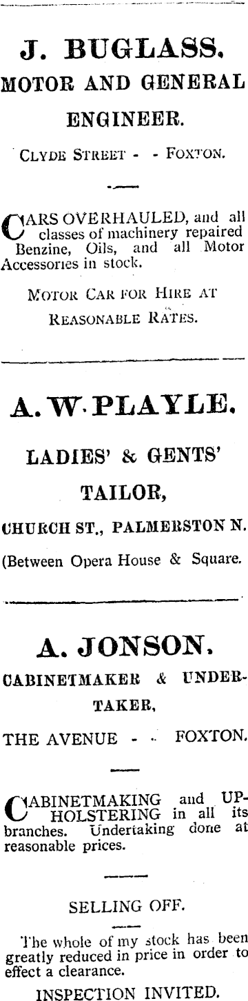J. BUGLASS, MOTOR AND GENERAL ENGINEER. Clyde Street - - Foxton, CARS OVERHAULED, and all classes of machinery repaired Benzine, Oils, and all Motor Accessories in slock. Motor Car tor Hire at Reasonable Rates. A.WPLAILE, LADIES’ & GENTS’ TAILOR, CHURCH ST., PALMERSTON N. (Between Opera House & Square. A. JONSON. CABINETMAKER & UNDERTAKER, THE AVENUE - - FOXTON. and UPJ BOLSTERING in all its branches. Undertaking done at reasonable prices. SELLING OFF. The whole of my stock has been greatly reduced in price in order to effect a clearance. INSPECTION INVITED.