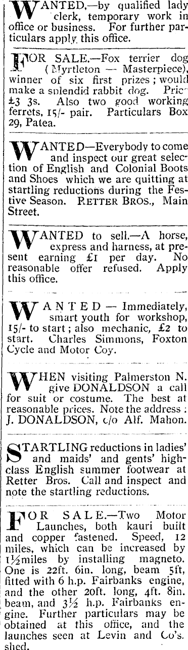 WANTED— by qualified lady clerk, temporary work in office or business. For further particulars apply this office. IjlOR SALE. —Fox terrier _ dog (Myrtleton Masterpiece), winner of six first prizes; would make a snlendid rabbit dog. Prkr £3 3s. Also two good working ferrets, is/- pair. Particulars Box 29, Patea. WANTED— Everybody to come and inspect our great selection of English and Colonial Boots and Shoes which we are quitting at startling reductions during the Festive Season. Retter Bros., Main Street. WANTED to sell—A horse, express and harness, at present earning £l per day. No reasonable offer refused. Apply this office. WANTED smart youth for workshop, 15/- to start; also mechanic, £2 to start. Charles Simmons, Foxton Cycle and Motor Coy. WHEN visiting Palmerston N. give DONALDSON a call for suit or costume. The best at reasonable prices. Note the address ; J. DONALDSON, c/o Alf. Mahon. STARTLING reductions in ladies’ and maids’ and gents’ highclass English summer footwear at Retter Bros. Call and inspect and note the startling reductions. OR SALE. —Two Motor . Launches, both kauri built and copper fastened. Speed, 12 miles, which can be increased by I Smiles by installing magneto. One is 22ft. 6in. long, beam sft, fitted with 6 h.p. Fairbanks engine, and the other 20ft, long, 4ft. Sin. beam, and 3V2 h.p. Fairbanks engine. Further particulars may be obtained at this office, and the launches seen at Levin and Co’s, shed.