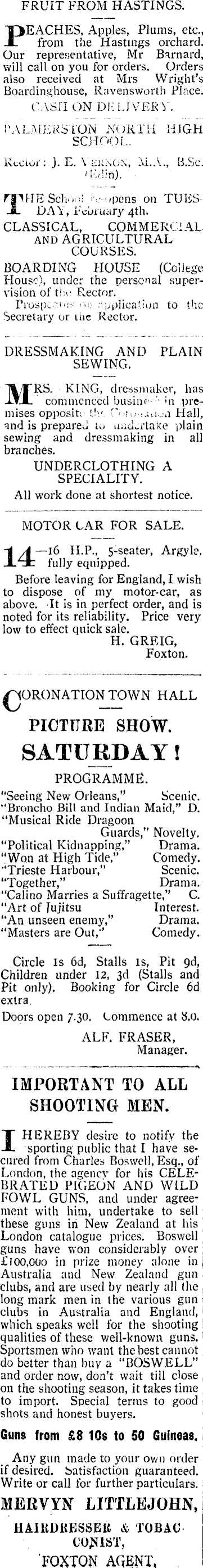 FRUIT FROM HASTINGS. PEACHES, Apples, Plums, etc., from the Hastings orchard. Our representative, Mr Barnard, will call on you for orders. Orders also received at Mrs Wright’s Boardinghouse, Ravensworth Place. CASH ON DELIVERY. PALMERSTON NORTH HIGH SCHOOL. Rector; J. E. V £UI\ON, M.A., B.Sc. ' Kdin). 'HM HE School • -pens on TUBSJL DAY, February 4th. CLASSICAL, COMMERCIAL AND AGRICULTURAL COURSES. BOARDING HOUSE (College 1 House), under the personal superj vision of tin- Rector. ! Prospco.i-.js ms- application to the Secretary or the Rector. DRESSMAKING AND PLAIN SEWING. MRS. KING, dressmaker, has commenced businf- ■ hi premises opposite the ('-.•rueatiun Hall, and is prepared to undertake plain sewing and dressmaking in all branches. UNDERCLOTHING A SPECIALITY. All work done at shortest notice. MOTOR CAR FOR SALE. 14 —l6 H.P., 5-seater, Argyle, fully equipped. Before leaving for England, I wish to dispose of my motor-car, as above. It is in perfect order, and is noted for its reliability. Price very low to effect quick sale. H. GREIG, Foxton. £JORONATION TOWN HALL PICTURE SHOW. SATURDAY! PROGRAMME. “Seeing New Orleans,” Scenic. “Broncho Bill and Indian Maid,” D. “Musical Ride Dragoon Guards,” Novelty, “Political Kidnapping,” Drama. “Won at High Tide,” Comedy. “Trieste Harbour,” Scenic. “Together,” Drama. “Calino Marries a Suffragette,” C. “Art of Jujitsu Interest. “An unseen enemy,” Drama. “Masters are Out,’’ Comedy. Circle is 6d, Stalls is, Pit 9d, Children under 12, 3d (Stalls and Pit only). Booking for Circle 6d extra. Doors open 7.30. Commence at S.o. ALF. FRASER, Manager. IMPORTANT TO ALL SHOOTING MEN. I HEREBY desire to notify the sporting public that I have secured from Charles Boswell, Esq., of London, the agency for his CELEBRATED PIGEON AND WILD FOWL GUNS, and under agreement with him, undertake to sell these guns in New Zealand at his London catalogue prices. Boswell guns have won considerably over £IOO,OOO in prize money alone in Australia and New Zealand gun clubs, and are used by nearly all the long mark men in the various gun clubs in Australia and England, which speaks well for the shooting qualities of these well-known guns. Sportsmen who want the best cannot do better than buy a “BOSWELL” and order now, don’t wait till dose on the shooting season, it takes time to import. Special terms to good shots and honest buyers. Guns from £8 10s to 50 Guineas. Any gun made to your own order if desired. Satisfaction guaranteed. Write or call for further particulars. MERVYN LITTLEJOHN, HAIRDRESSER & TOBAC COJHST, FOXTON AGENT,