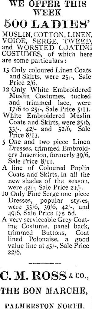 WE OFFER THIS WEEK 500 LADIES’ MUSLIN, COTTON, LINEN, VOIOE, SERGE, TWEED, and WORSTED COATING COSTUMES, of which here are some particulars: 15 Only coloured Linen Coats and Skirts, were 25/-, Sale Price 2/6. 12 Only White Embroidered Muslin Costumes, tucked and trimmed lace, were 17/6 to 25/-, Sale Price 5/11. White Embroidered Muslin Coats and Skirts, were 25/6, 35/-, 42/- and 52 16, Sale Price 8/11. 5 One and two piece Linen Dresses, trimmed Embroidery Insertion, formerly 39/6, Sale Price 8/11. A line of Coloured Poplin Coats and Skirts, in all the new shades of the season, were 42/-, Sale Price 21■/-. 10 Only Fine Serge one piece Dresses, popular sty.es, were 35/6, 39/6, 42/-, and 49/6, Sale Price 17s 6d. A very serviceable Grey Coating Costume, panel back, trimmed Buttons, Coat lined Polonaise, a good value line at 45/-, Sale Price 22/6. C.M.BOSS&CO.. THE BON MARCHE, PALMERSTON NORTH,