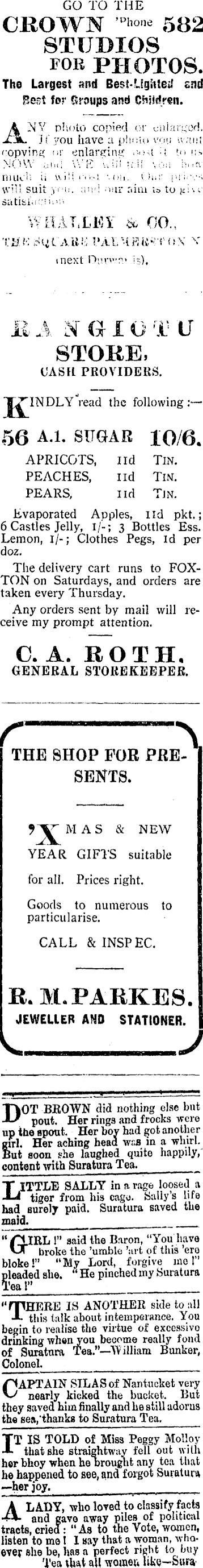 GO TO THE CROWN ,Pho ”* 582 STUDIOS for PHOTOS. The Largest and Best-lighted end Best for groups and Children. ANY photo copied or enlarged, if .you have a plmiu \'ou waul copying or enlarging .so-u '■[ to us NOW oi! m I WE 'win rril %cm ■ hi .tv much ii wlii ■.on. (!nr nri.-’'.-; will suit you. am! our aim is to gUv satiti-. -0.-. . W HAL LEY a 00., the ityCAiiu VAmruw'os v mext Dnovn* is). M A 5T GlO T U STOKE, CASH PROVIDERS. jg'INDLY read the following : 56 A.l. SUGAR 10/6. Evaporated Apples, lid pkt.; 6 Castles Jelly, I/-; 3 Bottles Ess. Lemon, I/-; Clothes Pegs, id per doz. The delivery cart runs to FOXTON on Saturdays, and orders are taken every Thursday. Any orders sent by mail will receive my prompt attention. C. A. ROTH. GENERAL STOREKEEPER. r THE SHOP POE PRESENTS. ’X MAS & NEW YEAR GIFTS suitable for all. Prices right. Goods to numerous to particularise. CALL &INSPEC, R.M.PAEKES. JEWELLER AND STATIONER. J DOT BROWN did nothing else but pout. Her rings and frocks were up the spout. Her boy had got another girl. Her aching head was in a whirl. But soon she laughed quite happily,' content with Suratura Tea. T ITTLE SALLY in a rage loosed a -LI tiger from his cage. Sally’s life had surely paid. Suratura saved the maid. “ /I IRL !” said the Baron, ‘‘You have LT" broke the ’umble ’art of this ’ere bloke!” "My Lord, forgive me I” Pleaded she. “He pinched my Suratura ’ea I” " rpHERE IS ANOTHER side to all -L tins talk about intemperance. You begin to realise the virtue of excessive drinking when you become really fond of Suratura Tea."—William Bunker, Colonel. SILAS of Nantucket very v nearly kicked the bucket. But they saved him finally and he still adorns the sea/thanks to Suratura Tea. IT IS TOLD of Miss Peggy Molloy that she straightway fell out with her bhoy when he brought any tea that he happened to see, and forgot Suratura —her joy. A LADY, who loved to classify facts and gavo away piles of political tracts, cried : "As to the Vote, women, listen to mo I 1 say that a woman, whoever she be, has a perfect right to buy Tea that all women like—Sura'