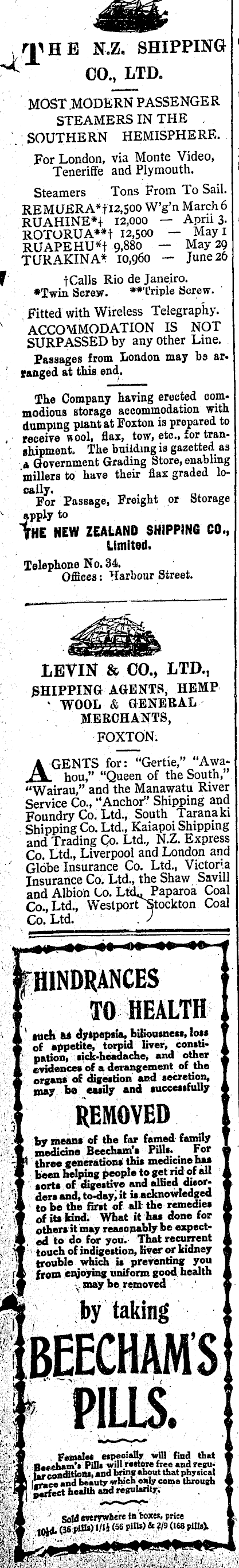 4HI V'TH ® N * z * 8 CO., LT MOST .MODERN P. STEAMERS II .SOUTHERN HE! For London, via M Teneriffe and PI Steamers Tons . REMUERA*ti2,SO0 1 RUAHINE*! 12,000 ROTORU A** t 12,50 RUAPEHU*t 9,880 TUR AKIN A* io,g6( fl tCalls Rio de J •Twin. Screw. **'< Fitted with Wireless X ACCOMMODATIOI SURPASSED by an; Passages from Loud ’ ranged at this end. The Company bavin modious storage accon damping plant at Foxto , receive wool, flax, toy shipment. The buiidii .* Government Grading millers to have their oally. . For Passage, Freig '• apply to THE NEW ZEALAND Limited Telephone No. 34. Offices: Harbos i. LEVIN & CO SHIPPING AGEN ' WOOL & GE MERCHAF FOXTOJ Agents for: “c hou,” “Queen “Wairau,” and the Mi Service Co., “Anchor’ Foundry Co. Ltd., Sc , Shipping Co. Ltd., Ka and Trading Qo. Ltd, Co. Ltd., Liverpool ai Globe Insurance Co. Insurance Co. Ltd., tl and Albion Co. Co., Ltd., Westport Co. Ltd. 'm ee~tf fHINDRANCEi