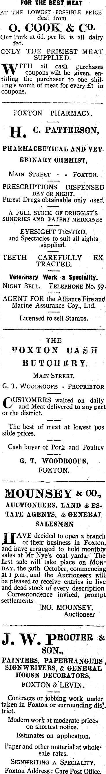 FOR THE BEST MEAT AT THE LOWEST POSSIBLE PRICE deal from O. COOK & CO. Our Pork at 6d. per lb. is all dairy fed. ONLY THE PRIMEST MEAT SUPPLIED. WITH all cash purchases coupons will be given, entitling the purchaser to one shilling’s worth of meat for every £l in coupons. FOXTON PHARMACY. C. PATTERSON, PHARMACEUTICAL AND VETERINARY CHEMIST, Main Street - - Foxton, PRESCRIPTIONS DISPENSED DAY OR NIGHT. Purest Drugs obtainable only used. A FULL STOCK OF DRUGGIST’S SUNDRIES AND PATENT MEDICINES EYESIGHT TESTED, and Spectacles to suit all sights supplied. TEETH CAREFULLY EX TRACTED. Veterinary Work a Speciality. Night Bell. Telephone No. 59, AGENT FOR the Alliance Fire arid Marine Assurance Coy., Ltd. Licensed to sell Stamps. THE CASH BUTCHER Y. Main Street. G. 1. Woodroofe - Proprietor CUSTOMERS waited on daily and Meat delivered to any part ox the district. The best of meat at lowest pos sible prices. Cash buyer of Pork and Poultry G. T. WOODROOFE, FOXTON. MOUNSEY & co„ AUCTIONEERS. LAND & ESTATE AGENTS, & GENERAL SALESMEN HAVE decided to open a branch of their business in Foxton, and have arranged to hold monthly sales at Mr Nye’s coal yards. The first sale will take place on Monday, the 30th October, commencing at I p.m-, and the Auctioneers will be pleased-to receive entries in live and dead stock of every description Correspondence invited, prompt settlements. JNO. MOUNSEY. Auctioneer J* W* p ROOTER & *SON., PAINTERS, PAPBEHANGEBS, SIGN WRITERS, & GENERAL HOUSE DECORATORS. FOXTON & LEVIN. Contracts or jobbing work under taken in Foxton or surrounding His!, trict. Modern work at moderate prices on shortest notice. ■ Estimates on application. Paper and other material at whole* sale rates. Signwriting a Speciality. Foxton Address: Care Post Office.