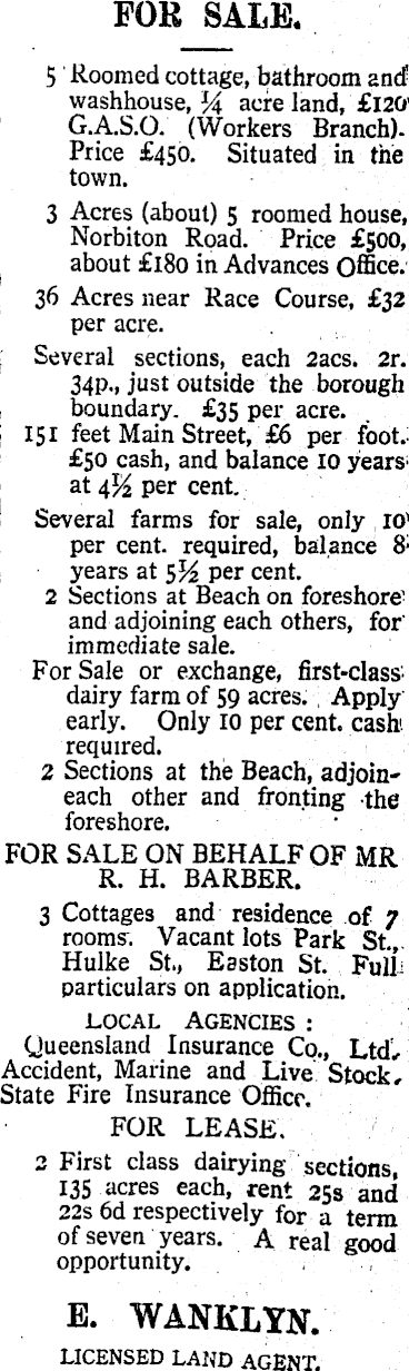 FOR SALE. 5 Roomed cottage, bathroom and washhouse, % acre land, £l2o’ G.A.S.O. (Workers Branch). Price £450. Situated in the town. 3 Acres (about) 5 roomed house, Norbiton Road, Price £SOO, about £IBO in Advances Office. 36 Acres near Race Course, £32 per acre. Several sections, each 2acs. 2r. 34P., just outside the borough boundary. £35 per acre. 151 feet Main Street, £6 per foot, £SO cash, and balance 10 yearsat 4% per cent. Several farms for sale, only 10' per cent, required, balance 8 ; years at 5% per cent. 2 Sections at Beach on foreshoreand adjoining each others, for’ immediate sale. For Sale or exchange, first-class-dairy farm of 59 acres. ■■ Apply early. Only 10 per cent, cashrequired. 2 Sections at the Beach, ad join* each other and fronting -the foreshore. • FOR SALE ON BEHALF OF MR R. H. BARBER. 3 Cottages and residence of 7 rooms. Vacant lots Park St.,. Hulke St., Easton St. FulL particulars on application. LOCAL AGENCIES ; Queensland Insurance Co., Ltd', Accident, Marine and Live Stock, State Fire Insurance Office. FOR LEASE. 3 First class dairying" sections, 135 acres each, rent 25s and 22s 6d respectively for a term of seven years. A real good opportunity. , , B. WANKLYN. LICENSED LAND AGENT.