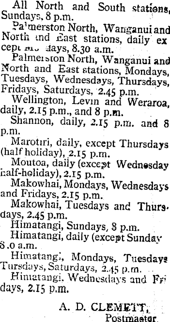 All North and South stations, Sundays, 8 p.m. Pa’ merston North, Wanganui and North ind n.ast stations, daily ex days, 8.30 a.m. Palmeiaton North, Wanganui and North and East stations, Mondays, Tuesdays, Wednesdays, Thursdays, Fridays, Saturdays, 2.45 p.m. Wellington, Levin and Weraroa daily, 2.15 p.m., and 8 p.m. Shannon, daily, 2,15 p.m. and 8 p.m. Marotiri, daily, except Thursdays (half holiday), 2.15 p.m. Moutoa, daily (except Wednesday half-holiday), 2.15 p.m. Makowhai, Mondays, Wednesdays and Fridays, 2.15 p.m. Makowhai, Tuesdays and Thursdays, 2.45 p.m. Himatangi, Sundays, 8 p.m. Himatangi, daily (except Sundav 8.0 a.m. Himatangj, Mondays, Tuesdays Tursdays, Saturdays, 2.45 p.m. . Himatangi, Wednesdays and F?’ days, 2.15 p.m. A. D. CLEMEIT,: Postmaster.