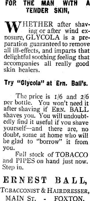 FOR THE MAN WITH A TENDER SKIN, WHETHER after shaving or after wind exposure, GLYCOLA is a preparation guaranteed to remove all ill-effects, and imparts that delightful soothing feeling that accompanies all really good skin healers. Try “Glycola” at Ern. Bail’s. The price is 1/6 and 2/6 per bottle. You won’t need it after shaving if Ern. BALL shaves you. You will undoubtedly find it useful if you shave yourself—and there are, no doubt, some at home who will be glad to “borrow” it from you. Full stock of TOBACCO and PIPES on hand just now. Step in. ERNEST BALL, Tobacconist & Hairdresser, MAIN St.- FOXTON.