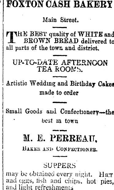 > FOXTON CASH BAKERY s ' Main Street. THE BEST quality of WHITE and BROWN BREAD delivered to all parts of the town and district. f UP-TO-DATE AFTERNOON : TEA ROOD'S. Artistic Wedding and Birthday Cakes | made to order ! Small Goods and Confectionery—-the best in toirn M. E. PERREATT, Bak-kh ani> CojJi’uci’ioM»a, SUPPERS may be obtained every night. Harr and eggs, tish and chips. hot pies, and li.ii.ht refreshniejua