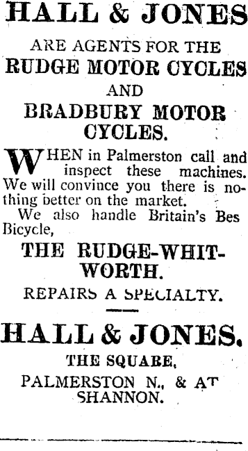 HALL & JONES ARE AGENTS FOR THE RUDGB MOTOR CYCLES AND BRADBURY MOTOR CYCLES. WHEN in Palmerston call and inspect these machines. We will convince you there is nothing better on the market. r We also handle Britain’s Bes Bicycle, THE RUDGE-WHIT-WORTH. REPAIRS A SPECIALTY. HALL & JONES, THE SQUARE. PALMERSTON N., & AT SHANNON. ,