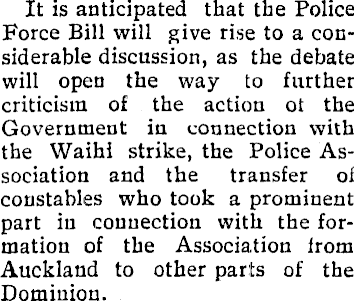 It is anticipated that the Police Force Bill will give rise to a considerable discussion, as the debate will open the way to further criticism of the action ot the Government in connection with the Waihi strike, the Police Association and the transfer of constables who took a prominent part iu connection with the formation of the Association irom Auckland to other parts of the Dominion.