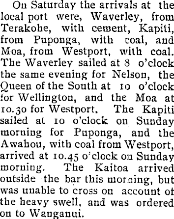 On Saturday the arrivals at the local port were, Waverley, from Terakohe, with cement, Kapiti, from Puponga, with coal, and Moa, from Westport, with coal. The Waverley sailed at 8 o’clock the same evening for Nelson, the Queen of the South at 10 o’clock for Wellington, and the Moa at r 0.30 for Westport. The Kapiti sailed at xo o’clock on Sunday morning for Puponga, and the Awahou, with coal from Westport, arrived at 10.45 o’clock on Sunday morning. The Kaitoa arrived outside the bar this morning, but was unable to cross on account ot the heavy swell, and was ordered on to Wanganui.