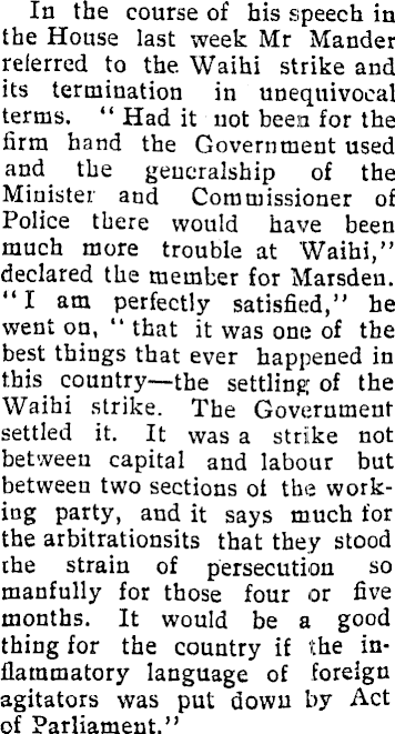 In the course of his speech in the House last week Mr Mander referred to the Waihi strike and its termination in unequivocal terms. “ Had it not been for the firm hand the Government used and the generalship of the Minister and Commissioner of Police there would have been much more trouble at Waihi,” declared the member for Matsden. “I am perfectly satisfied,” he went on, “ that it was one of the best things that ever happened in this country—the settling of the Waihi strike. The Government settled it. It was a strike not between capital and labour but between two sections ot the working party, and it says much for the arbitrationsits that they stood the strain of persecution so manfully for those four or five months. It would be a good thing for the country if the inflammatory language of foreign agitators was put down by Act of Parliament.”
