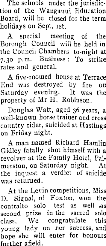 The schools under the jurisdiction of the Wanganui Education Board, will be closed for the term holidays on Sept. ist. A special meeting of the Borough Council will be held in the Council Chambers to-night at 7,30 p.m. Business: To strike rates and general. A five-roomed house at Terrace End was destroyed by fire on Saturday evening. It was the property of Mr H, Robinson. Douglas Watt, aged 36 years, a well-known horse trainer and cross country rider, suicided at Hastings on Friday night. A man named Richard Hamlin Gidley fatally shot himself with a revolver at the Family Hotel, Palmerston, on Saturday night. At the inquest a verdict of suicide was returned. At the Devin competitions, Miss D. Signal, of Foxtou, won the contralto solo test as well as second prize in the sacred solo class. We congratulate this young lady on her success, and hope she will enter for honours further afield.