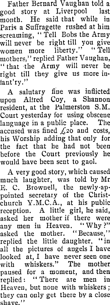 Father Bernard Vaughan told a good story at Liverpool last month. He said that while in Paris a Suffragette rushed at him screaming, “ Tell Bobs the Army will never be right till you give women more liberty.” “ Tell mothers,” replied Father Vaughan, “that the Army will never be right till they give us more inlant’ry.” A salutary fine was inflicted upon Alfred Coy, a Shannon resident, at the Palmerston S.M. Court yesterday for using obscene language in a public place. The accused was fined £2O and costs, his Worship adding that only for the fact that he had not been before the Court previously he would have been sent to gaol. A very good story, which caused much laughter, was told by Mr E. C. Brownell, the newly-ap-pointed secretary of the Christchurch Y.M.C.A., at his public reception. A little girl, he said, asked her mother if there were any men in Heaven. “Why?” asked the mother. “Because,” replied the little daughter, “in all the pictures of angels I have looked at, I have never seen one with whiskers.” The mother paused for a moment, and then replied: “There are men in Heaven, but none with whiskers ; they can only get there by a close shave.”