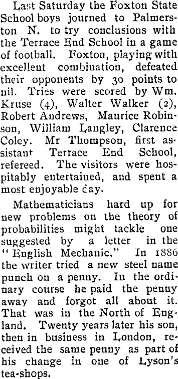 East Saturday the Foxton State School boys journed to Palmerston N. to try conclusions with the Terrace End School in a game of football. Foxton, playing with excellent combination, defeated their opponents by 30 points to nil. Tries were scored by Wm. Kruse (4), Walter Walker (2), Robert Andrews, Maurice Robinson, William Langley, Clarence Coley. Mr Thompson, first assistant Terrace End School, refereed. The visitors were hospitably entertained, and spent a most enjoyable cay. Mathematicians hard up for new problems on the theory of probabilities might tackle one suggested by a letter in the “ English Mechanic,” In 1880 the writer tried a new steel name punch on a penny. In the ordinary course he paid the penny away and forgot all about it. That was in the North of England. Twenty years later his son, then in business in London, received the same penny as part of his change in one of Lyson’s tea-shops.