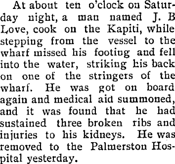 At about ten o’clock on Saturday night, a man named J. B Love, cook on the Kapiti, while stepping from the vessel to the wharf missed his footing and fell into the water, striking his back on one of the stringers of the wharf. He was got on board again and medical aid summoned, and it was found that he had sustained three broken ribs and injuries to his kidneys. He was removed to the Palmerston Hospital yesterday.