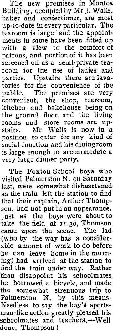The new premises in Moutoa Building, occupied by Mr J. Walls, baker and confectioner, are most up-to-date in every particular. The tearoom is large and the appointments in same have been fitted up with a view to the comfort of patrons, and portion of it has been screened off as a semi-private tearoom for the use of ladies and parties. Upstairs there are lavatories for the convenience of the public. The premises are very convenient, the shop, tearoom, kitchen and bakehouse being on the ground floor, and the living rooms and store rooms are upstairs. Mr Walls is now in a position to cater for any kind of social function and his diningroom is large enough to accommodate a very large dinner party. The Foxton School boys who visited Palmerston N. on Saturday last, were somewhat disheartened as the train left the station to find that their captain, Arthur Thompson, had not putin an appearance. Just as the boys were about to take the field at 11.30, Thomson came upon the scene. The lad (who by the way has a considerable amount of work to do before he can leave home in the morning) had arrived at the station to find the train under way. Rather than disappoint his schoolmates he borrowed a bicycle, and made the somewhat strenuous trip to Palmerston N. by this means. Needless to say the boy’s sports-man-like action greatly pleased his schoolmates and teachers, —Well done, Thompson !