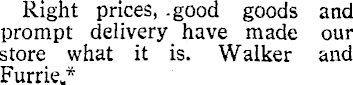 Right prices, .good goods and prompt delivery have made our store what it is. Walker and Furrie.*
