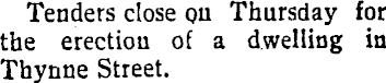 Tenders close on Thursday for the erection of a dwelling in Thynne Street.