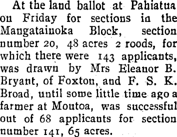 At the land ballot at Fabiatua on Friday for sections in the Mangataiuoka Block, section number 20, 48 acres 2 roods, for which there were 143 applicants, was drawn by Mrs Eleanor B. Bryant, of Foxton, and F. S. K. Broad, until some little time ago a farmer at Moutoa, v/as successful out of 68 applicants for section number i4t, 65 acres.