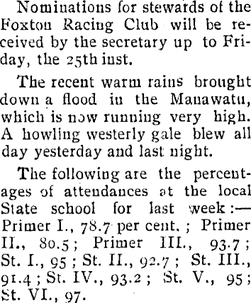 Nominations for stewards of the Foxtou Racing Club will be received by the secretary up to Friday, the 25th iust. The recent warm rains brought down a flood in the Mauawatu, which is now running very high. A howling westerly gale blew all day yesterday and last night. The following are the percentages of attendances at the local State school for last week: — Primer 1., 78.7 per cent. ; Primer 11., 80.5; Primer 111., 93.7; St. 1., 95 ; St. 11., 92.7 ; St. 111., 91.4 ; St. IV., 93.2 ; St. V., 95; St. VI., 97.