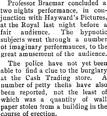 Professor Braemar concluded a two nights performance, in conjunction with Hayward’s Pictures, at the Royal last night before a fair audience. The hypnotic subjects went through a number of imaginary performances, to the great amusement of the audience. The police have not yet been able to find a clue to the burglary at the Cash Trading store. A number of petty thefts have also been reported, not the least of which was a quantity of wall paper stolen from a building iu the course of erection.
