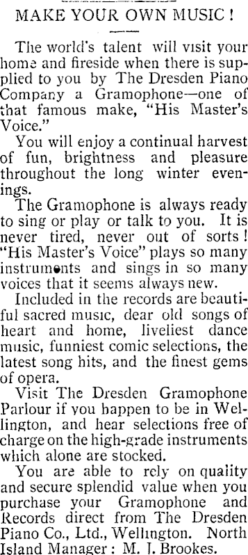 MAKE YOUR OWN MUSIC ! The world’s talent will visit your home and fireside when there is supplied to you by The Dresden Piano Company a Gramophone —one of that famous make, “His Master’s Voice.” You will enjoy a continual harvest of fun, brightness and pleasure throughout the long winter evenings. The Gramophone is always ready to sing or play or talk to you. It is never tired, never out of sorts! “His Master’s Voice” plays so many instruments and sings in so many voices that it seems always new. Included in the records are beautiful sacred music, dear old songs of heart and home, liveliest dance music, funniest comic selections, the latest song hits, and the finest gems of opera. Visit The Dresden Gramophone Parlour if you happen to be in Wellington, and hear selections free of charge on the high-grade instruments which alone are stocked. You are able to rely on quality and secure splendid value when you purchase your Gramophone and Records direct from The Dresden Piano Co., Ltd., Wellington. North Island Manager ; M. I. Brookes.