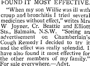 hOUND IT MOST EFFECTIVE. “When my son Willie was ill with croup and bronchitis I tried several medicines without effect,” writes Mrs W Joyner, Cr, Beattie and Elliott Sts., Balmain, N.S.W. “Seeing an advertisement on Chamberlain’s Cough Remedy I decided to try it and the effect was really splendid. I have also found it most effective for the other members of my family.” For sale everywhere.—Advt.