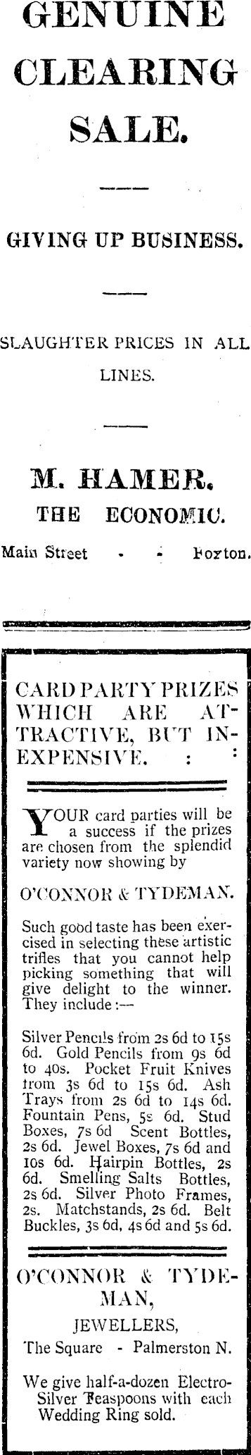 GENUINE CLEARING SALE. GIVING GP BUSINESS. SLAUGHTER PRICES IN ALL LINES. M. HAMER, THE ECONOMIC. Main Street - - Norton. gCSWMBMEM——BBIM—B—^ CARD PARTY PRIZES WHICH ARE ATTRACTIVE, BUT INEXPENSIVE. : : YOUR card parties win be a success if the prizes are chosen from the splendid variety now showing by O’CONNOR & TYDEMAN. Such good taste has been exercised in selecting these artistic trifles that you cannot help picking something that will give delight to the winner. They include; — Silver Pencils from 2s 6d to 15s 6d. Gold Pencils from Qs 6d to 40s, Pocket Fruit Knives trom 3s 6d to 15s 6d. Ash Trays from 2s 6d to 14s 6d. Fountain Pens, 5s 6d. Stud Boxes, 7s 6d Scent Bottles, 2s 6d. Jewel Boxes, /s 6d and 10s 6d. IJairpin Bottles, 2s 6d. Smelling Salts Bottles, 2s 6d. Silver Photo Frames, 2s. Matchstands, 2s 6d, Belt Buckles, 3s 6d, 4s 6d and 5s 6d. O’CONNOR & TYDEMAN, JEWELLERS, The Square - Palmerston N. We give half-a-dozen ElectroSilver Teaspoons with each Wedding Ring sold.