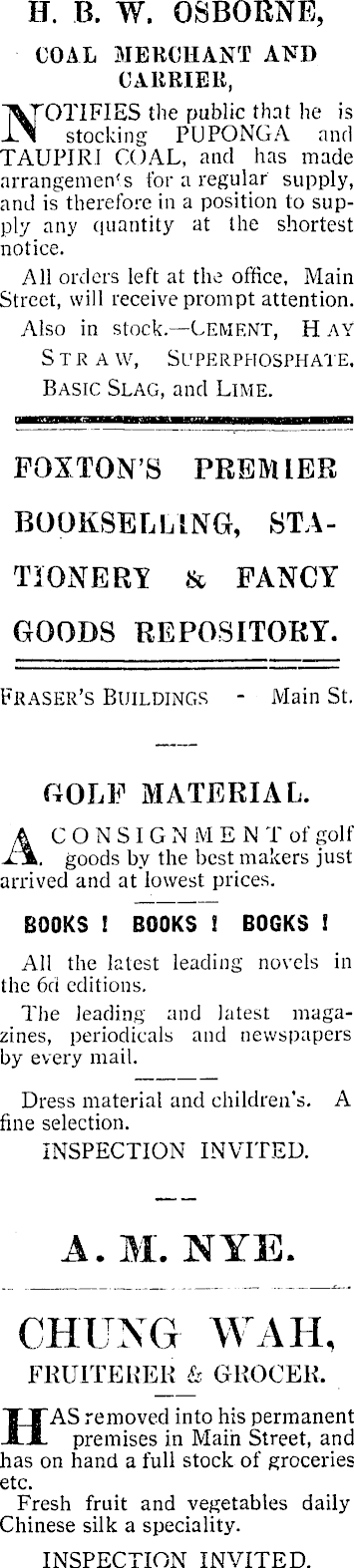 H. B. W. OSBORNE, COAL MERCHANT AND CARRIER, NOTIFIES the public that he is stocking PUPONGA and TAUPIRI COAL, and has made arrangements for a regular supply, and is therefore in a position to supply any quantity at the shortest notice. All orders left at the office. Main. Street, will receive prompt attention. Also in stock.— -Cement, Hay Straw, Superphosphate. Basic Slag, and Lime. POXTON’S PREMIER BOOKSELLING, STATIONER'S & FANCY GOODS REPOSITORY. Fraser’s Buildings - Main St. GOLF MATERIAL. A CONSIGN MEN T of golf . goods by the best makers just arrived and at lowest prices. BOOKS ! BOOKS ! BOOKS ! All the latest leading novels in the 6d editions. The leading and latest magazines, periodicals and newspapers by every mail. Dress material and children’s. A fine selection. INSPECTION INVITED. A. M. NIE. CHUNG WAH, FRUITERER & GROCER. HAS removed into his permanent premises in Main Street, and has on hand a full stock of groceries etc. Fresh fruit and vegetables daily Chinese silk a speciality. INSPECTION INVITED.