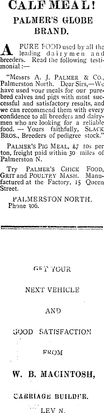 CALF MEAL! PALMER’S GLOBE BRAND. A PURE FOOD used by all the leading dairymen and breeders. Read tlie following testimonial : “Messrs A. J. Palmer & Co., Palmerston North. Dear Sirs, —We have used meals for our purebred calves and pigs with most successful and satisfactory results, and we can recommend them with every confidence to all breeders and dairymen who are looking for a reliable food. Yours faithfully, Slack Bros., Breeders of pedigree stock.” Palmer’s Pig Meal, £7 ios per ton, freight paid within 30 miles of Palmerston N. Try Palmer’s Chick Food, Grit and Poultry Mash. Manufactured at the Factory, 15 Queen Street. PALMERSTON NORTH. Phone 306. L c T YOUR NEXT VEHICLE AND GOOD SATISFACTION from W. B. MACINTOSH, carriage builder. ■" LEV N.