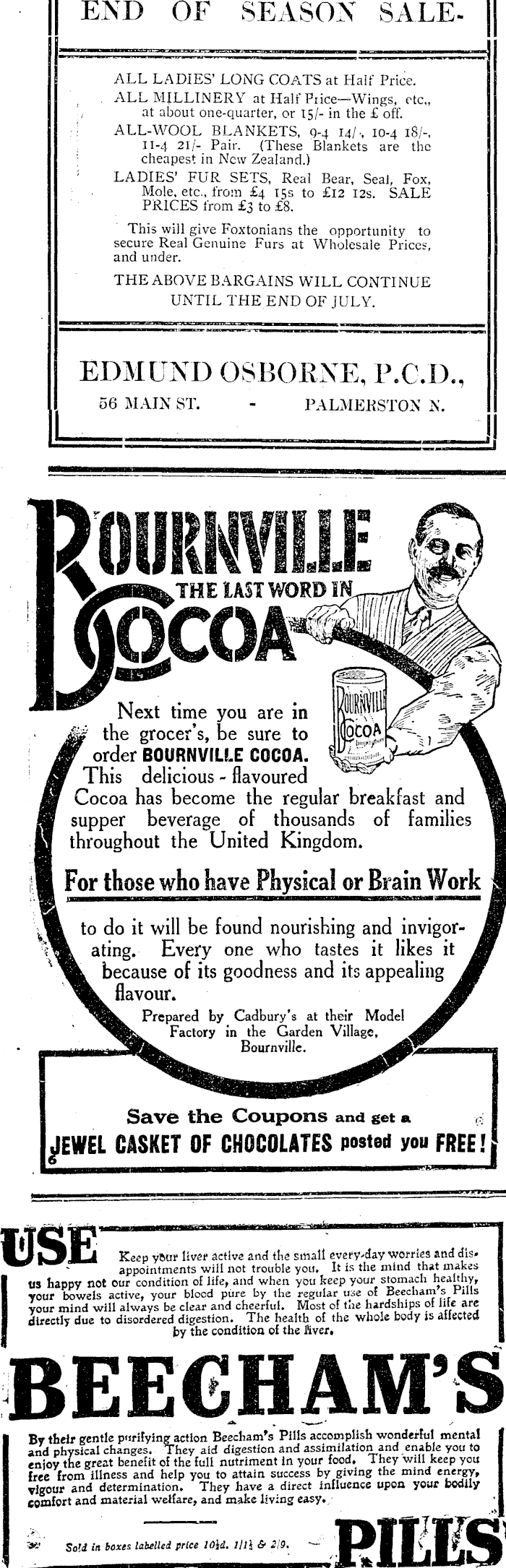 END OF SEASON SALEALL LADIES’ LONG COATS at Half Price. ALL MILLINERY at Half Price—" Wings, etc,, at about one-quarter, or 15/- in the £ off. ALL-WOOL BLANKETS, 9-4 14/ •, 10-4 18/-, 11-4 21/- Pair. (These Blankets are the cheapest in New Zealand.) LADIES’ FUR SETS, Real Bear, Seal, Fox, Mole, etc., from £4 15s to £l2 12s. SALE PRICES from £3 to £B. This will give Foxtonians the opportunity to secure Real Genuine Furs at Wholesale Prices, and under. THE ABOVE BARGAINS WILL CONTINUE UNTIL THE END OF JULY. EDMUND OSBORNE, P.C.D., 06 MAIN ST.- PALMEKSTON N. DnURNVIUf I TjWUlLjm 1 AST WORD IftLr Next time you are in the grocer’s, be sure to order BOURNVILLE COCOA. This delicious - flavoured Cocoa has become the regular breakfast and supper beverage of thousands of families throughout the United Kingdom. For those who have Physical or Brain Work to do it will be found nourishing and invigorating. Every one who tastes it likes it because of its goodness and its appealing flavour. Prepared by Cadbury’s at their Model Factory in the Garden Village, Bournvillc. Save the Coupons and get a jIEWEL CASKET OF CHOCOLATES posted you FREE? sc OCOA Keep yßiir liver active and the small every-day worries and disappointments will not trouble you. It is the mind that makes US happy not our condition of life, and when you keep your stomach healthy, your bowels active, your blood pure by the regular use of Beecham s rills your mind will always be clear and cheerful. Most of the hardships of lac arc directly due to disordered digestion* The health of the whole body is Ailected by the condition of the liver. BEECHAM’S By their gentle purifyingaction Beecham’s Pills accomplish wonderful mental and physical changes. They aid digestion and assimilation and enable you to enjoy the great benefit of the full nutriment In your food. They will keep you free from illness and help you to attain success by giving the mind energy, vigour and determination. They have a direct influence upon your bodily comfort and material welfare, and make living easy. IS Sold in boxes labelled price 10id. 11l J & 219. II