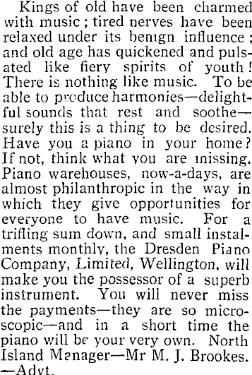 Kings of old have been charmed with music ; tired nerves have been relaxed under its benign influence ; and old age has quickened and pulsated like fiery spirits of youth! There is nothing like music. To be able to produce harmonies —delightful sounds that rest and soothe — surely this is a thing to be desired. Have you a piano in your home? If not, think what you are missing. Piano warehouses, now-a-days, are almost philanthropic in the way in which they give opportunities for everyone to have music. For a trifling sum down, and small instalments monthly, the Dresden Piano Company, Limited, Wellington, will make you the possessor of a superb instrument. You will never miss the payments —they are so microscopic—and in a short time the piano will be your very own. North Island Manager—Mr M, J. Brookes. —Advt.