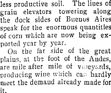 less productive soil. The lines of grain elevators towering along the dock sides of Buenos Aires speak for the enormous quantities of corn which are now being exported 3 ? ear by year. On the far side of the great plains, at the foot of the Andes, are mile after mile of vineyards, producing wine which can hardly meet the demand already made for it.