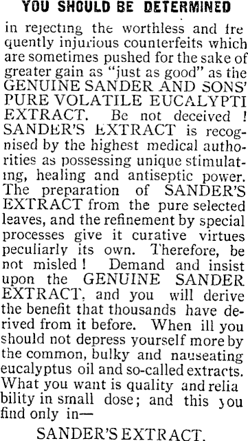 YOU SHOULD BE DETERMINED in rejecting the worthless and fre quently injurious counterfeits which are sometimes pushed for the sake of greater gain as “just as good” as the GENUINE SANDER AND SONS’ PURE VOLATILE EUCALYPTI EXTRACT. Be not deceived ! SANDER’S EXTRACT is recognised by the highest medical authorities as possessing unique stimulating, healing and antiseptic power. The preparation of SANDER’S EXTRACT from the pure selected leaves, and the refinement by special processes give it curative virtues peculiarly its own. Therefore, be not misled ! Demand and insist upon the GENUINE SANDER EXTRACT, and you will derive the benefit that thousands have derived from it before. When ill you should not depress yourself more by the common, bulky and nauseating eucalyptus oil and so-called extracts. What you want is quality andrelia bility in small dose; and this jou find only in— SANDER’S EXTRACT.