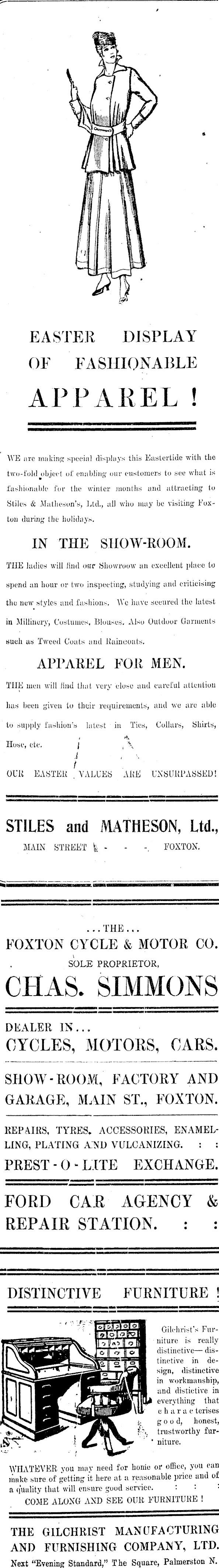 EASTER DISPLAY OF FASHIONABLE APPAREL ! WE are making special displays this Eastertide with the two-fold object of enabling our customers to see what is fashionable for the winter months and attracting to Stiles & Matheson’s, Ltd., all who may be visiting Foxton during the holidays. IN THE SHOW-ROOM. THE ladies will Jind our Showroow an excellent place to spend an hour or two inspecting, studying and criticising the new styles and fashions. We have secured the latest in Millinery, Costumes, Blouses, Also Outdoor Garments such us Tweed Coats and Raincoats, APPAREL FOR MEN. THE men will find that very close and careful attention has been given to their requirements, and we are able to supply fashion's latest in Ties, Collars, Shirts, - a. Hose, etc. j , \ J , a / OUR EASTER VALUES ARE UNSURPASSED! STILES and MATHESON, Ltd., MAIN STREET FOXTON. ...THE.,. FOXTON CYCLE & MOTOR CO. SOLE PROPRIETOR, CHAS. SIMMONS DEALER 1N... CYCLES, MOTORS, CARS. SHOW - ROOM, FACTORY AND GARAGE, MAIN ST., FOXTON. REPAIRS, TYRES, ACCESSORIES, ENAMELLING, PLATING AND VULCANIZING. : : PREST ■0 - LITE EXCHANGE. FORD CAE AGENCY & REPAIR STATION. : : DISTINCTIVE FURNITURE ! r- -V 31 i^r Gilchrist’s Furniture is really distinctive — distinctive in design, distinctive in workmanship, and distictive in everything that char a c terises good, honest, trustworthy furniture. WHATEVER you may need for home or office, you can make sure, of getting it here at a reasonable price and of a quality that will ensure good service. '• : COME ALONG AND SEE OUR FURNITURE ! THE GILCHRIST MANUFACTURING AND FURNISHING COMPANY, LTD. Next “Evening Standard,” The Square, Palmerston N.