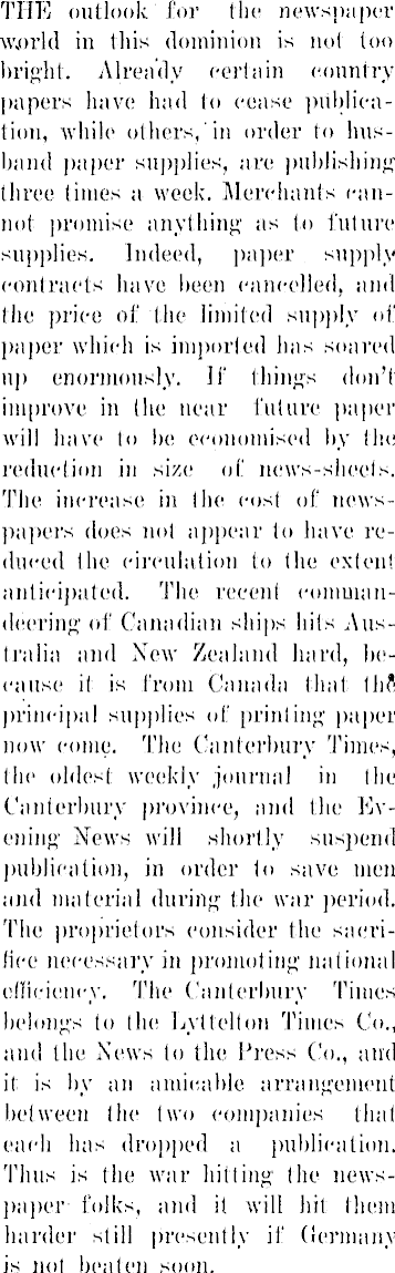 THE outlook for the* newspaper world in this dominion is not 100 bright. Already eertain country papers have had to cease publication, while others, 'in order to husband paper supplies, are publishing' three times a week. Merchants cannot promise anything as to future supplies. Indeed, paper supply contracts have been cancelled, and the price of the limited supply of paper which is imported has soared up enormously. If things don’t improve in the near future paper will have to be economised by the reduction in size of news-sheets. The increase in the cost of newspapers does not appear to have reduced the circulation to (he extent anticipated. The recent commandeering of Canadian ships hits Australia and New Zealand hard, because it is from Canada that tbfl principal supplies of printing paper now come. The Canterbury Times, the oldest weekly journal in the Canterbury province, and the Evening News will shortly suspend publication, in order to save men and material during the war period. The proprietors consider the sacrifice necessary in promoting national efficiency. The Canterbury Times belongs to the Lyttelton Times Co., and the News to the Press Co., and it is by an amicable arrangement between the (wo companies that each has dropped a publication. Thus is the war hitting the newspaper folks, and it Avill hit them harder still presently if Germany is not beaten soon.