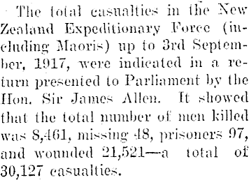 The total casualties in the New Zealand Expeditionary Force (including Maoris) up to 3rd September, 1917, -were indicated in a return presented to Parliament by the Hon. Sir James Allen. It showed that the total number of men killed was 8,461, missing 48, prisoners 97, and wounded 21,521 —a total of 30,127 casualties.