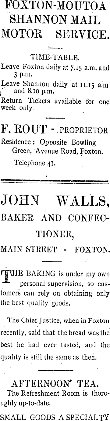 FOXTON-MO UTO A SHANNON MAIL MOTOR SERVICE. TIME-TABLE. Leave Foxton daily at 7.15 a.m. and 3 p.m. Leave Shannon daily at 11,15 a m r and 8.10 p.m. Return Tickets available for one week only. F. ROUT “.PROPRIETOR Residence: Opposite Bowling Green, Avenue Road, Foxton. Telephone 41. JOHN WALLS, BAKER AND CONFECTIONER, MAIN STREET - FOXTON. nnHE BAKING is under my own personal supervision, so customers can rely on obtaining only the best quality goods. The Chief Justice, when in Foxton recently, said that the bread was the best he had ever tasted, and the quality is still the same as then. AFTERNOON' TEA. The Refreshment Room is thoroughly up-to-date. SMALL GOODS A SPECIALTY