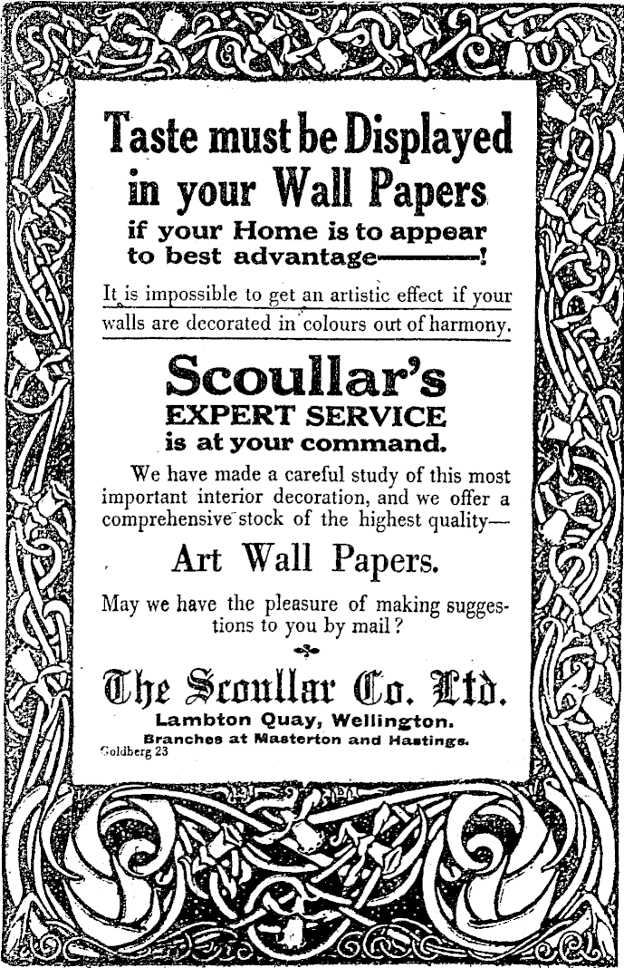 Taste must be Displayed in your Wall Papers if your Home is to appear to best advantage-—————! It^is impossible to get an artistic effect if your walls are decorated in colours out of harmony. Scoullar’s EXPERT SERVICE is at your command. We have made a careful study of this most important interior decoration, and we offer a comprehensive" stock of the highest quality— Art Wall Papers. May we have the pleasure of making suggestions to you by mail ? jimtllar Cn. Lambton Quay, Wellington. Branches at Masterton and Hastings. Goldberg 23