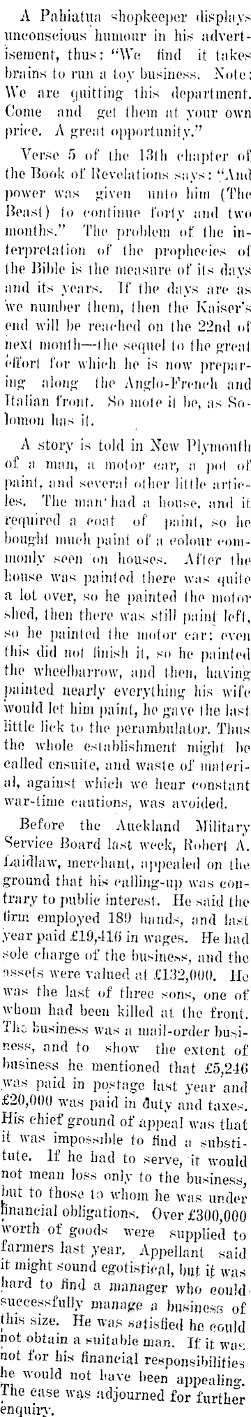 A Pahiatua shopkeeper displays unconscious humour in his advertisement, thus: “We find it takes brains to run a toy business. Note: We are quitting this department. Come and get them at your own price. A great opportunity.” Verse 5 of the 13(h chapter of (he Book of Revelations says: “And power was given unto him {The Beast) to continue forty and two months.” The problem of the interpretation of the prophecies of the Bible is the measure of its days and its years. If the days are as we number them, (hen the Kaiser’s end will be reached on the 22nd of next month —(he sequel to the great effort for which he is now preparing along (he Anglo-French and Italian front. So mote it be, as Solomon has it. A story is told in New Plymouth of a man, a motor car, a pot of paint, and several other little articles. The man'had a house, and it required a coat of paint, so lie bought much paint of a colour commonly seen on houses. After (he house was painted there was quite a lot over, so he painted the motor shed, then there was still paint left, so lie painted the motor ear: even this did not finish it, so he painted the wheelbarrow, and then, having painted nearly everything his wife would let him paint, ho gave (he last little liek to the perambulator. Tims the whole establishment might bo called ensuite, and waste of material, against which we hear constant war-time cautions, was avoided. Before the Auckland Military Service Board last week, Robert A. Laidlaw, merchant, appealed on the ground that his calling-up was contrary to public interest. He said the linn employed 18!) hands, and last year paid £19,416 in wages. He bad sole charge of the business, and the assets were valued at £132,000. He was the last of three sons, one of whom bad been killed at the front. Tim business was a mail-order business, and to show the extent of business he mentioned that £5,240 was paid in postage last year and £20,000 was paid in duty and taxes. His chief ground of appeal was that it was impossible to find a substitute. If he bad to serve, it would not mean loss only to the business, but to those to whom he was under financial obligations. Over £300,000 worth of goods were supplied to farmers last year. Appellant said it might sound egotistical, but if was hard to find a manager who could successfully manage a business of this size. He was satisfied he could not obtain a suitable man. If it was not for bis financial responsibilities he would not have been appealing. The ease was adjourned for further enquiry.