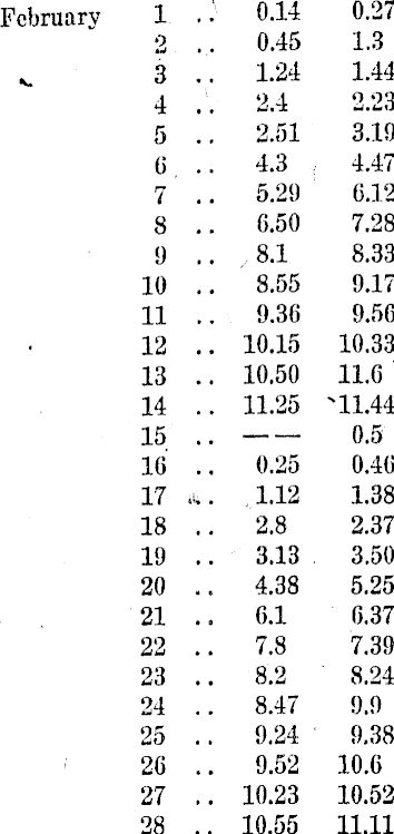 February 1 0.14 0.27 2 0.45 1.3 v 3 1.24 1.44 4 2.4 2.23 5 2.51 3.19 6 , 4.3 4.47 7 5.29 6.12 8 6.50 7.28 9 „ 8.1 8.33 10 8.55 9.17 11 9.36 9.56 12 10.15 10.33 13 10.50 11.6 ' 14 11.25 '11.44 15 — 0.5 16 0.25 0.46 17 ili . ,1.12 1.38 18 2.8 2.37 19 3.13 3.50 20 4.38 5.25 21 6.1 6.37 22 7.8 7.39 23 8.2 8.24 24 8.47 9.0 25 9.24 9,38 26 9.52 10.6 27 10.23 10.52 28 10.55 11.11