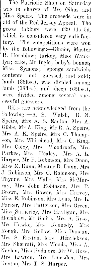 The Patriotic Shop on Saturday was in charge of Mrs Gibbs and Miss Speirs. The proceeds were in aid of the Red Jersey Appeal. The gross takings were £29 14s sd, which is considered very satisfactory. The competitions were won by the following: —Dinner, Master. R. Hornblow; turkey, Miss Wanklyu; cake, Mr Ingle; baby’s bonnet* Miss Symons; sponge sandwich,' contents not guessed, and sold; lamb (381b5.), was divided among lamb (381b5.), and sheep (05ihs.), were divided among several successful guessers. Gifts are acknowledged from the following:—A. S. Walsh, R. N. Speirs, Mrs A. S. Easton, Mrs A. Gibbs, Mr A. King, Mr R. A. Speirs, Mi’s A. K. Speirs, Mrs C. Thompson, Mrs Whitehead, Mrs C. King, Mrs Coley, Mrs Woodroofe, Mrs Parkes, Mrs Healey, Mrs A. L. Harper, Mr F. Robinson, Mrs Dunn, Miss K. Dunn, Master D. Dunn, Mrs J. Robinson, Mrs C. Robinson, Mrs Thynne, Mrs Walls, Mrs McMurray, Mrs John Robinson, Mrs P. Drown, Mrs Gower, Mrs Harvey, Miss E. Robinson, Mrs Dyne, Mrs L. Parker, Mrs Patterson, Mrs Green, Miss ,Satherley, Mrs Hartigan, Mrs Hornldow, Mr Smith, Mrs A. Ross, Mrs Hawke, Mrs Kennedy, Mrs Rough, Mrs Kellow, Miss Duncan, Mrs S. Easton, Mrs ITenricksen, Mrs Sherratt, Mrs Woods, Miss A, -\cylon, Miss Podmoro, Mr W. Ross, Mi-s Lawton, Mrs Lumsden, Mrs, Renton, Mrs T. 8. Harper.