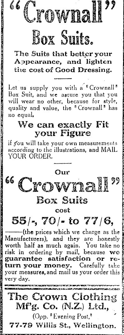 Crownall” Box Suits. The Suits that better your Appearance, and lighten the cost of Good Dressing. Let us supply you with a 11 Crownall" Box Suit, and we assure you that you will wear no other, because for style, quality and value, the "Crownall" has no equal, We can exactly Fit your Figure if you will take your own measurements according to the illustrations, and MAIL YOUR ORDER. Our “ Crownall Box Suits cost 55/-, 70/- to 77/6, -(the prices which we charge as the Manufacturers), and they are honestly worth half as much again. You take no risk in ordering by mail, because we j guarantee satisfaction or re-1 turn your money. Carefully tak your measures, and mail us your order this 1 very day. The Crown Clothing Mf’g. Co. (N.Z.) Ltd., . (Opp." Evening Post," 77-79 Willis St., Wellington.