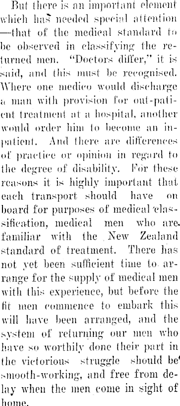 But there is an important element which has needed special attention —that of the medical standard to be observed in classifying the returned men, “Doctors differ,” it is said, and this must be rceognised. "Where one medico would discharge a man with provision for out-pati-ent treatment at a hospital, another would order him to become an inpatient. And (here are differences of practice or opinion in regard to the degree of disability. For these reasons it is highly important that each transport should have on board for purposes of medical 'classification, medical men who are. familiar with the , New Zealand standard of treatment. There has not yet been sufficient time to arrange for the supply of medical men with this experience, hut before the tit men commence to embark this will have been arranged, and the system of returning our men who have so worthily done their part in the victorious struggle should be* smooth-working, and free from delay when the men come in sight of home.