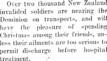 Over two thousand New Zealand invalided soldiers are nearing the Dominion on transports, and will have the’ pleasure of spending Christmas among their friends, unless their ailments are too serious to permit discharge before hospital treatment.