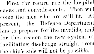 First for return are the hospital cases and convalescents. Then will come the men who are still lit. At present, the Defence Department lias to prepare for the invalids, and for this reason the new system of facilitating discharge straight from the ship’s side will not be possible.